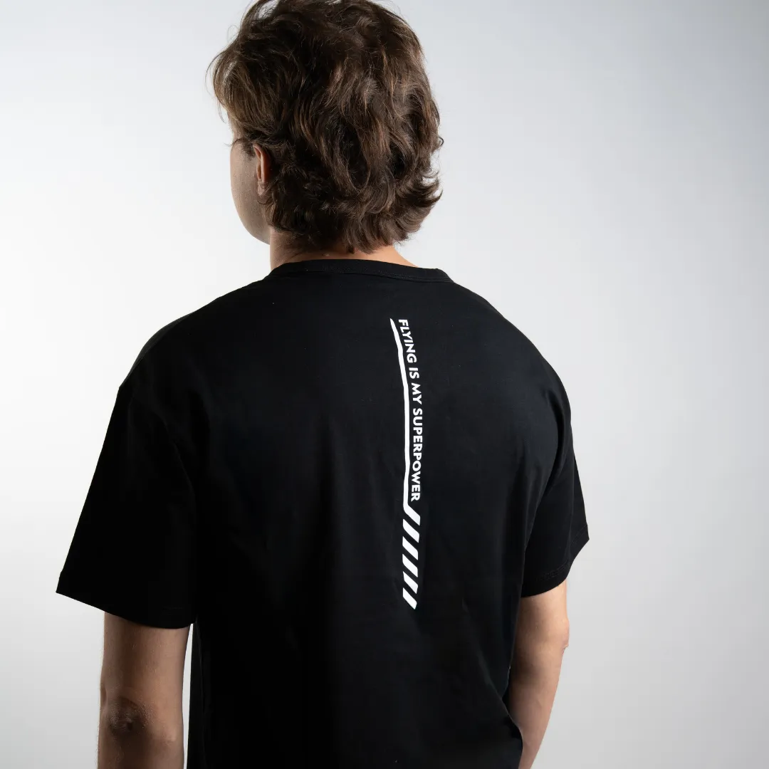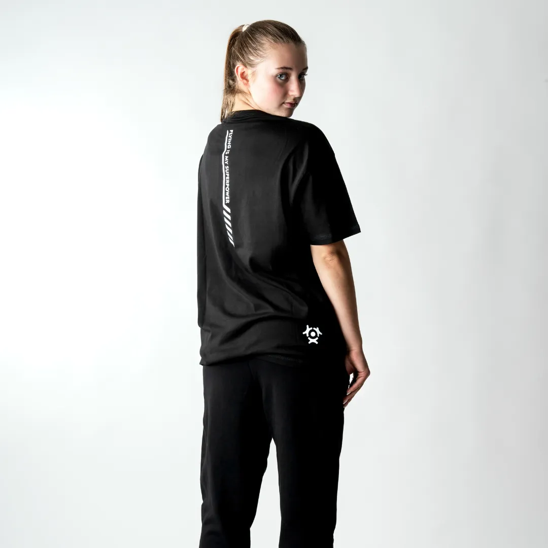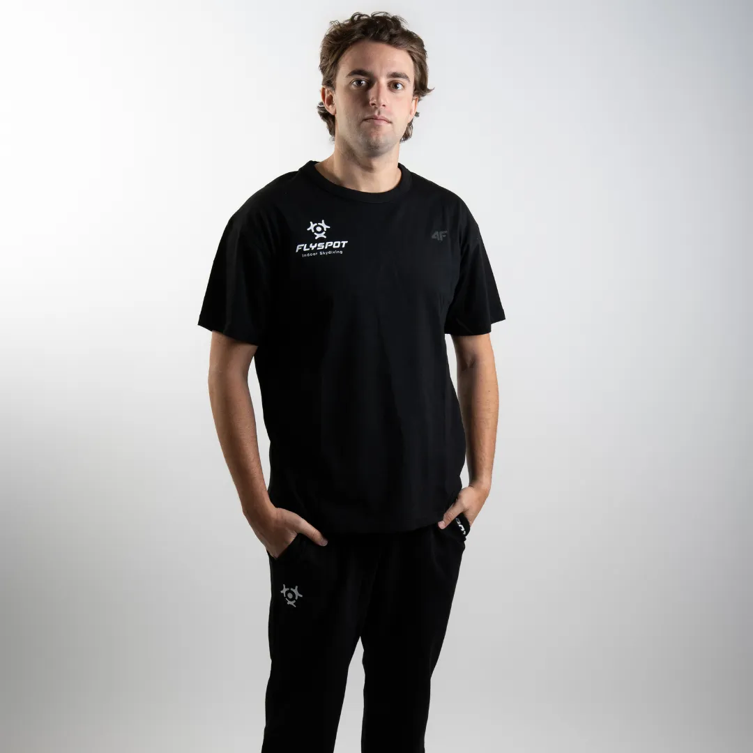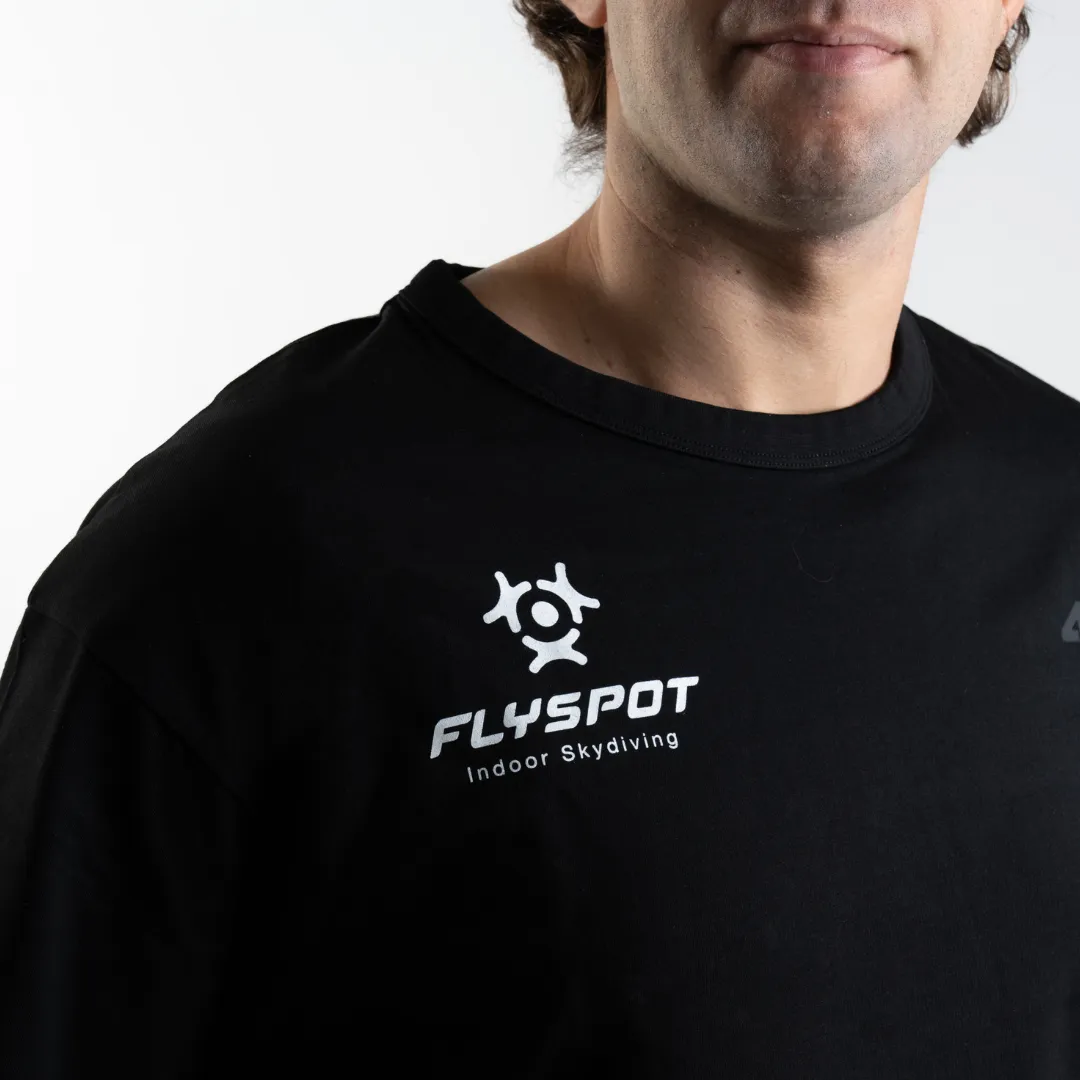 Na przodzie znajduje się logo Flyspot – Indoor Skydiving oraz subtelne oznaczenie marki 4F, a na plecach – pionowy nadruk z napisem “FLYING IS MY SUPERPOWER”, który podkreśla energię społeczności Flyspot.